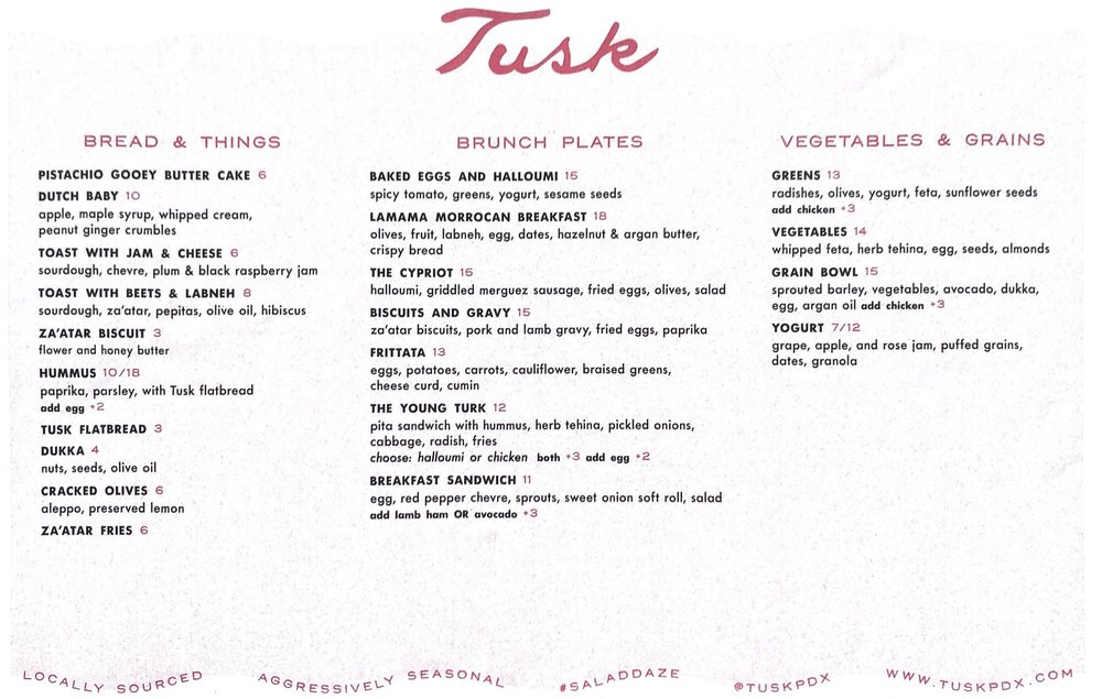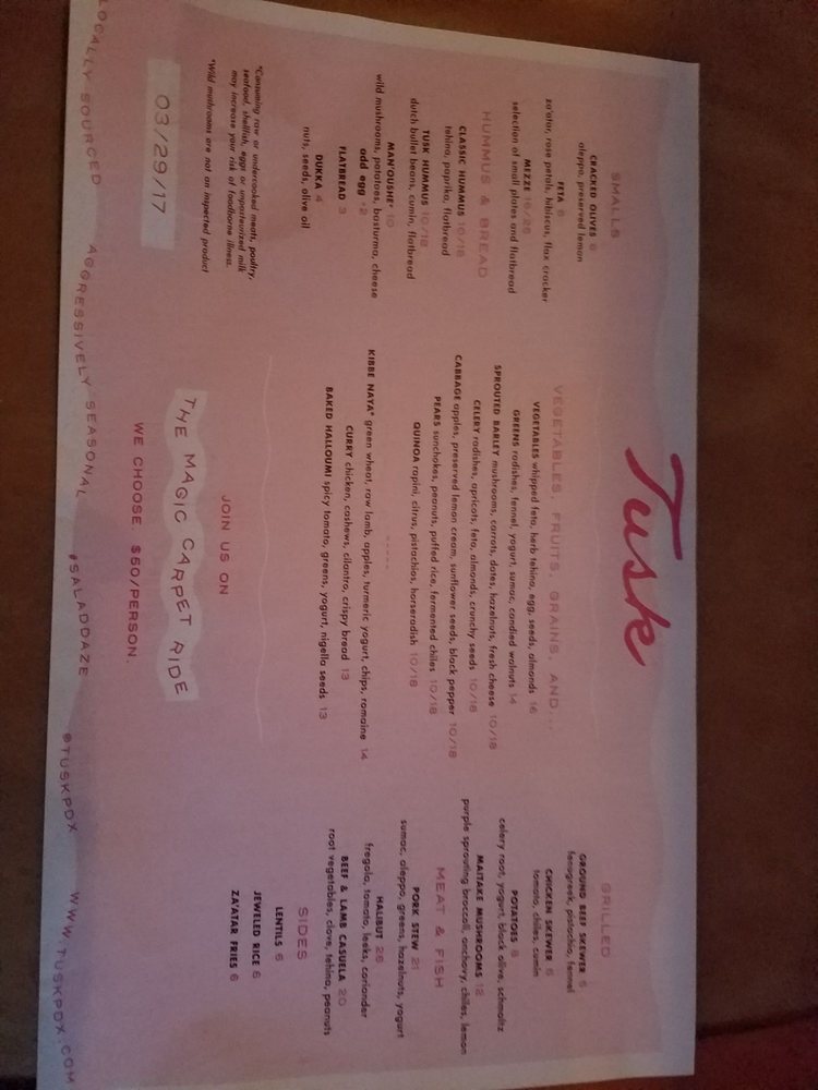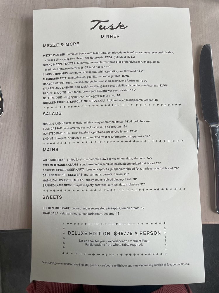 Tusk, a Mediterranean-Middle Eastern restaurant located in Portland, offers a diverse menu with options for pescatarians, vegans, and vegetarians. The establishment provides a trendy and casual dining experience, welcoming groups, kids, and even dogs on their heated and covered outdoor seating. With excellent service and a full bar offering happy hour specials, Tusk is a great spot for brunch or dinner. The restaurant is wheelchair accessible, with gender-neutral restrooms and plastic-free packaging. They also offer delivery, takeout, and catering services, making it convenient for all diners. Don't miss out on the flavorful dishes and unique dining experience at Tusk.